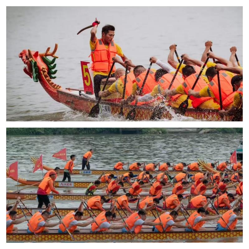 參賽者們齊心協(xié)力,和著鼓點(diǎn)的節(jié)奏,奮力劃槳,龍舟如離弦之箭在水面上飛馳。