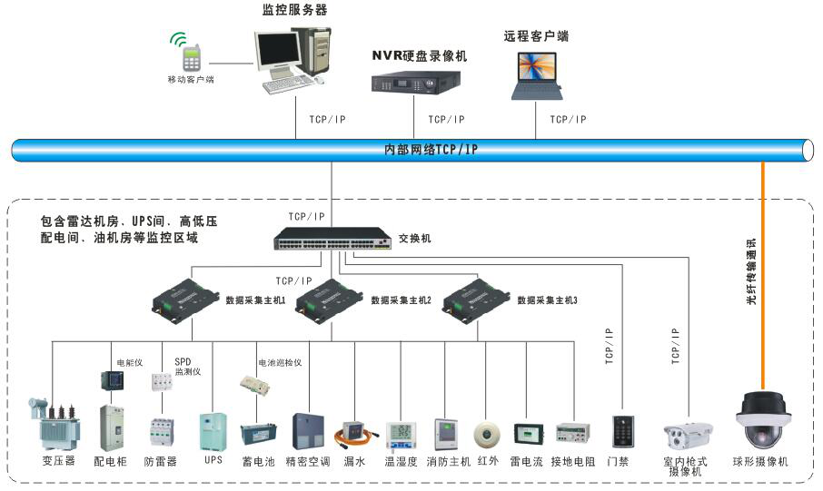 雷達(dá)站綜合監(jiān)控管理系統(tǒng)應(yīng)能實(shí)現(xiàn)對高壓配電柜、變壓器、低壓配電柜、柴油發(fā)電機(jī)、UPS、各類配電柜(箱)、直流電源、蓄電池組和配電機(jī)房工作環(huán)境等運(yùn)行參數(shù)和運(yùn)行狀態(tài)數(shù)據(jù)的實(shí)時(shí)監(jiān)視和遠(yuǎn)程顯示,并在異常情況下能自動(dòng)報(bào)警。