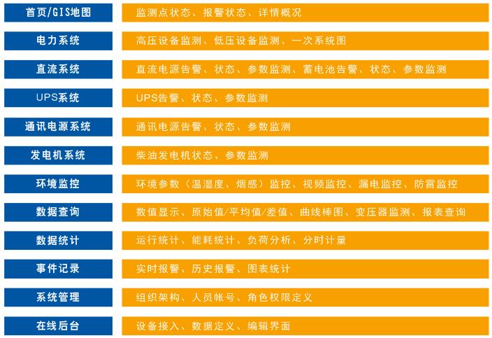 綜合監(jiān)控管理系統(tǒng)包括:電力監(jiān)控系統(tǒng)、工藝配電監(jiān)控系統(tǒng)和工作環(huán)境監(jiān)控系統(tǒng)三個(gè)獨(dú)立的子系統(tǒng)。綜合監(jiān)控管理系統(tǒng)包括對高低壓配電柜、變壓器、柴油發(fā)電機(jī)組設(shè)備的監(jiān)控;工藝配電監(jiān)控系統(tǒng)包括對UPS,蓄電池的監(jiān)控;工作環(huán)境監(jiān)控系統(tǒng)包括溫濕度、煙感、水浸等環(huán)境傳感器的參數(shù)監(jiān)測,以及視頻監(jiān)控、門禁監(jiān)控、防雷監(jiān)控、漏電監(jiān)測等安防安全監(jiān)控設(shè)備的實(shí)時(shí)監(jiān)控,實(shí)現(xiàn)對機(jī)房系統(tǒng)外部環(huán)境工作狀態(tài)的監(jiān)測。