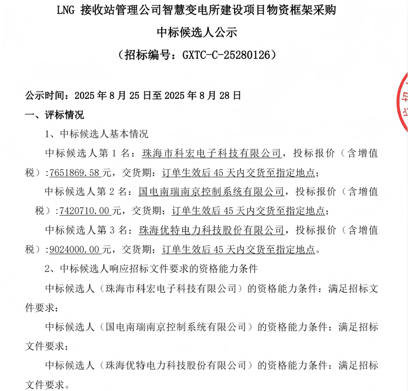 近日,在國家管網(wǎng)集團深圳天然氣有限公司--LNG接收站管理公司智慧變電所建設(shè)項目招標(biāo)中,